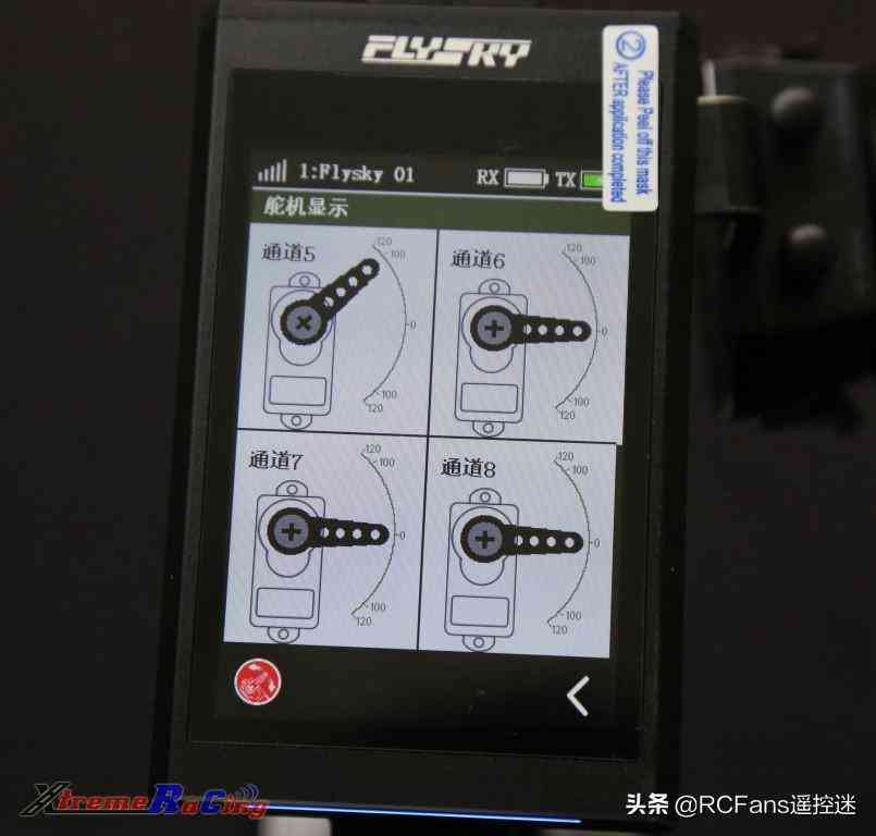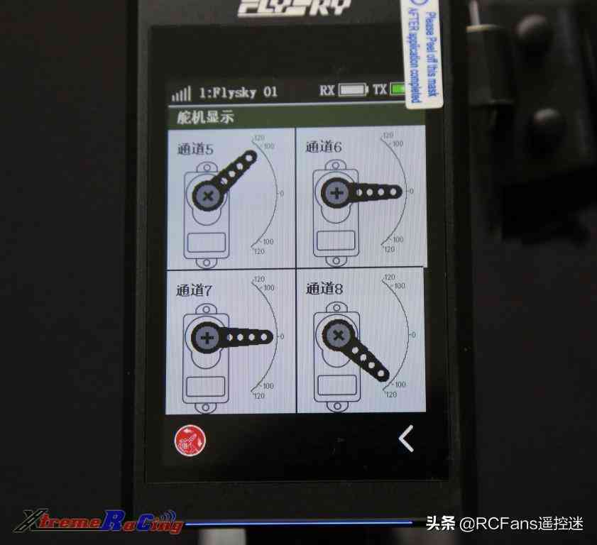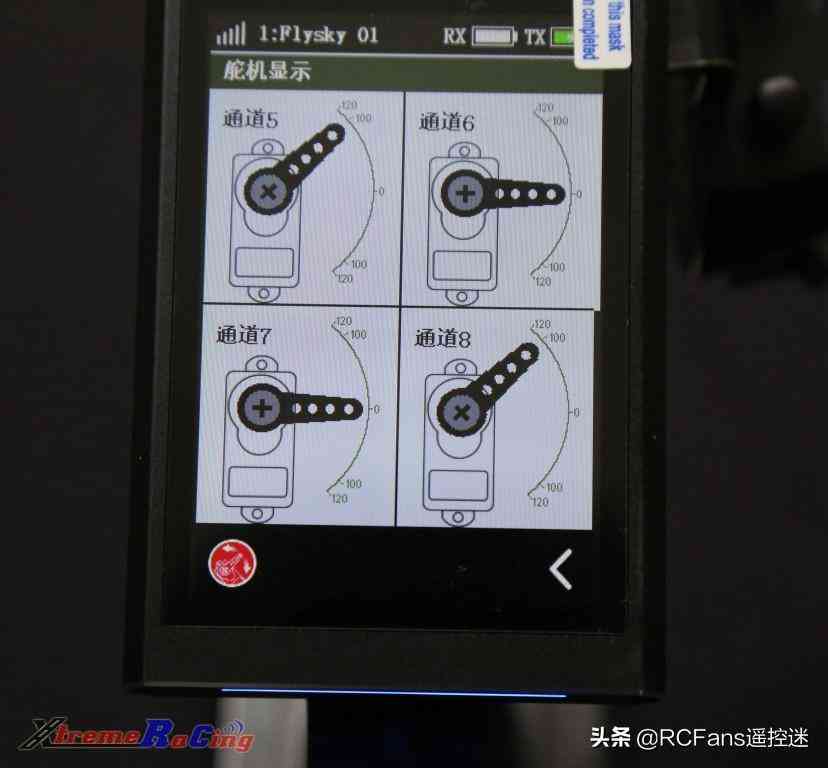 到此我們看一下此前將SW2設(shè)置為通道5的“翻轉(zhuǎn)”控制以及TR3設(shè)置為通道8的“3檔”控制效果 (點(diǎn)擊第二頁主界面的“舵機(jī)顯示”圖標(biāo)可進(jìn)入下面舵機(jī)位置顯示頁面) 按之前默認(rèn)設(shè)定設(shè)置好后,通道5與通道8的位置默認(rèn)都在舵機(jī)一側(cè)