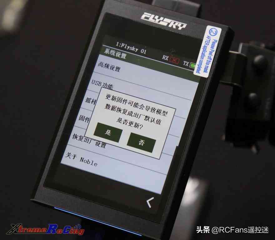 強(qiáng)制更新完成之后,重新對頻即可。***用戶可以在富斯官網(wǎng)NB4資料下載頁面找到更新高頻與接收機(jī)的操作視頻 https://www.flysky-cn.com/nb4xiazai5. 固件更新固件也就是遙控器的操作系統(tǒng),當(dāng)官方添加新功能,修正一些BUG,或者其他需要的時(shí)候就會(huì)發(fā)布新的固件,此時(shí)就需要用戶進(jìn)行更新固件操作。當(dāng)有新固件發(fā)布時(shí),用戶可以到NB4專用的固件下載頁面下載,鏈接:https://www.flysky-cn.com/nb4xiazai首先確認(rèn)自己目前的固件版本,在系統(tǒng)設(shè)置菜單,拉到最下方,點(diǎn)擊關(guān)于Noble字樣,就可以看到當(dāng)前的固件版本,如下圖: