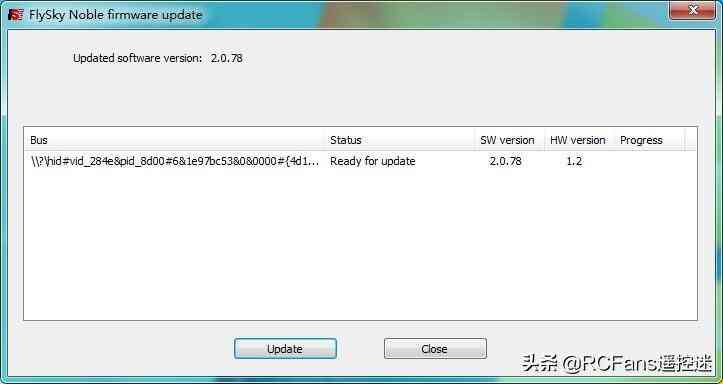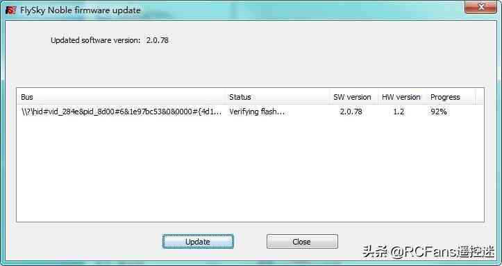 鼠標(biāo)點(diǎn)擊軟件下方的Update按鈕,則會(huì)開始更新遙控固件,界面Progress下方會(huì)顯示當(dāng)前進(jìn)度,靜待100%完成之后重新開機(jī)即可。