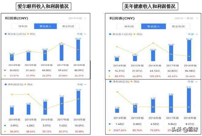股價強(qiáng)弱背后是兩家公司業(yè)績表現(xiàn)的強(qiáng)弱體現(xiàn),雖然2018年以前這兩家公司的收入利潤幾乎相同,但是2019年上半年,愛爾眼科收入47.49億,同比增長25.64%,利潤同比增長36.53%,繼續(xù)保持高增長,但是美年健康收入預(yù)計只有36.41億,增長停滯,利潤同比下滑60-90%至只剩1588萬-6352萬。
