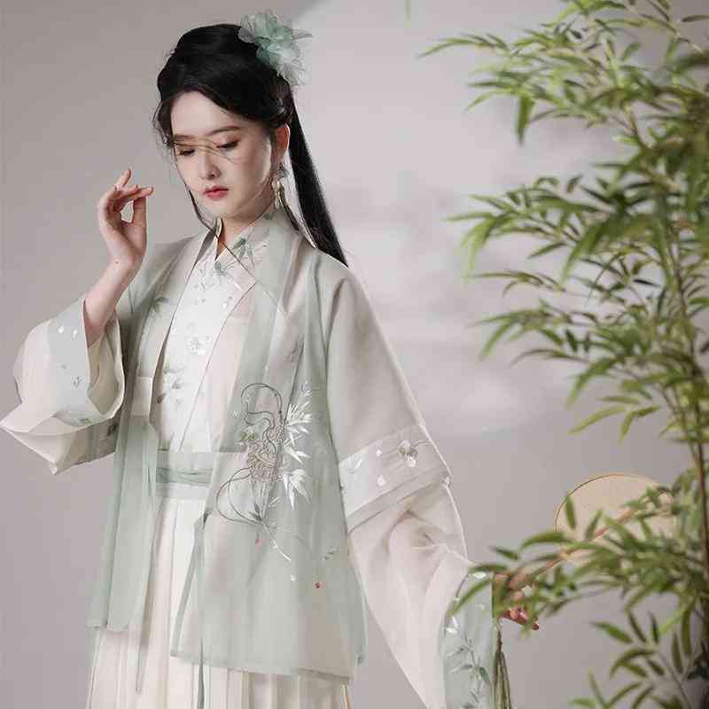 [清涼的配色和若隱若現(xiàn)的竹葉刺繡,更添飄逸之感。]