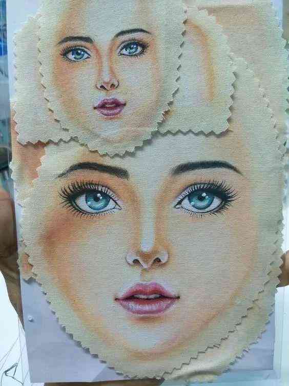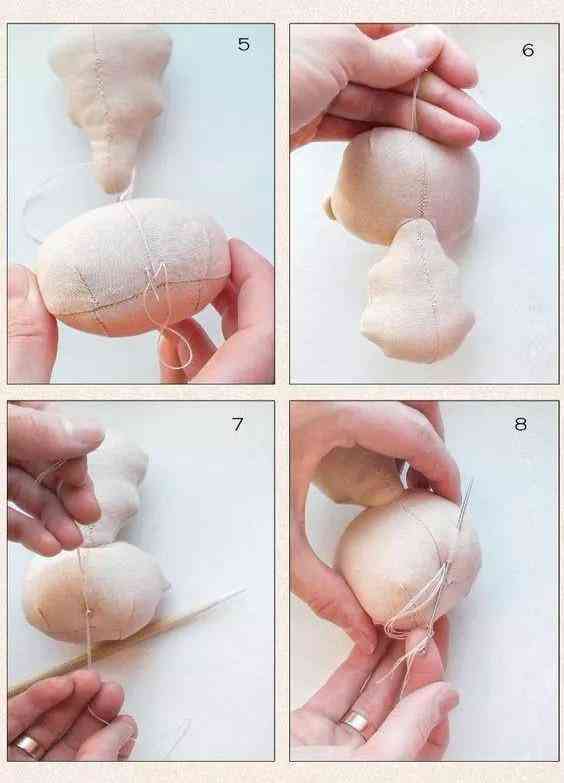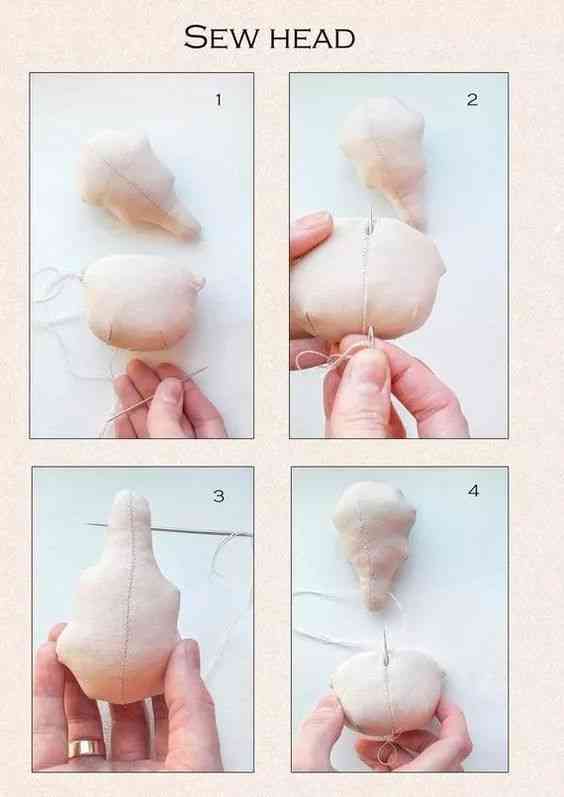 準(zhǔn)備一塊膚色的布,用顏料和化妝品畫(huà)出娃娃的臉,或有印染好現(xiàn)成的布料,也能直接使用。如果不會(huì)畫(huà)畫(huà),覺(jué)得太復(fù)雜,可先剪出橢圓形的布,做出頭部,最后用珠子或繡線縫出眼睛嘴巴即可。