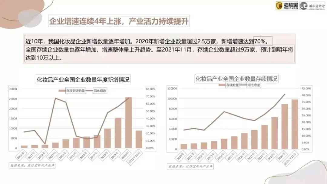 2021年1-11月 中國化妝品市場規(guī)模達(dá)3678億元,超過2020年全年,增速達(dá)15.3%。入局化妝品行業(yè)的企業(yè)數(shù)量也在不斷增加,2020年新增企業(yè)數(shù)量超過2.5萬家,新增增速達(dá)到70%。截至2021年11月,存續(xù)企業(yè)數(shù)量約為9萬家,預(yù)計(jì)到明年將達(dá)到10萬以上。
