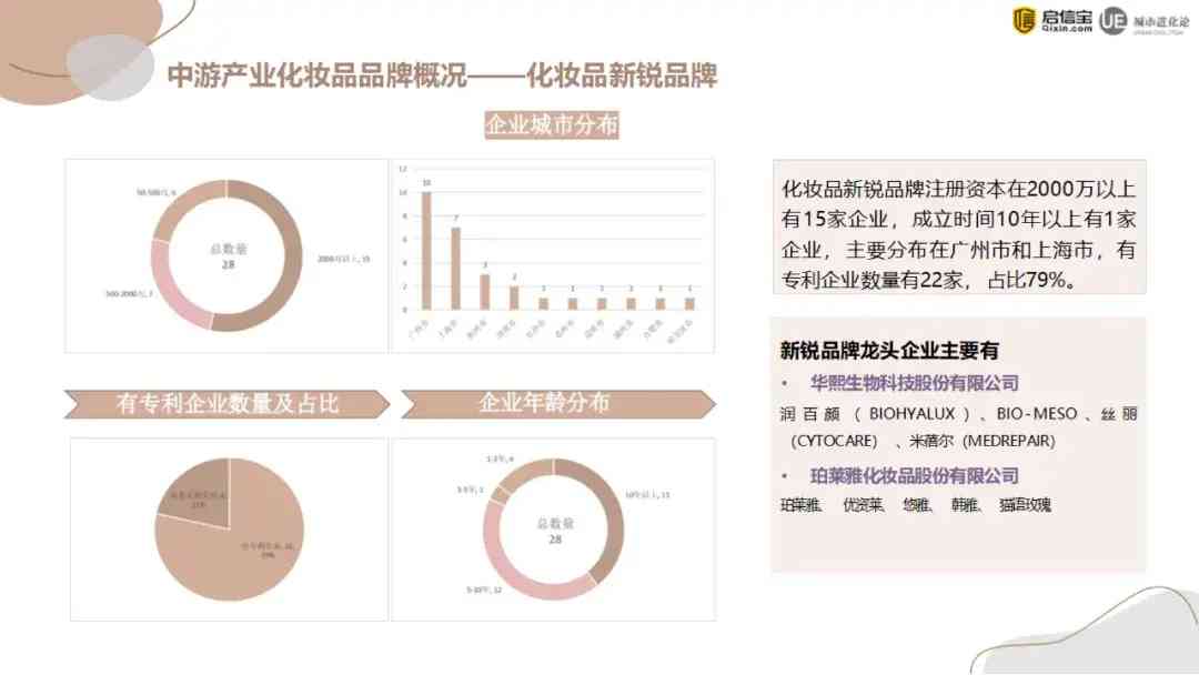 同時(shí),國內(nèi)新銳品牌也不斷崛起,占領(lǐng)彩妝、護(hù)膚、男士個(gè)護(hù)、口腔護(hù)理等各個(gè)細(xì)分賽道。其中新銳品牌注冊資本超過2000萬的有15家企業(yè),有專利技術(shù)的企業(yè)數(shù)量為22家,占比79%。