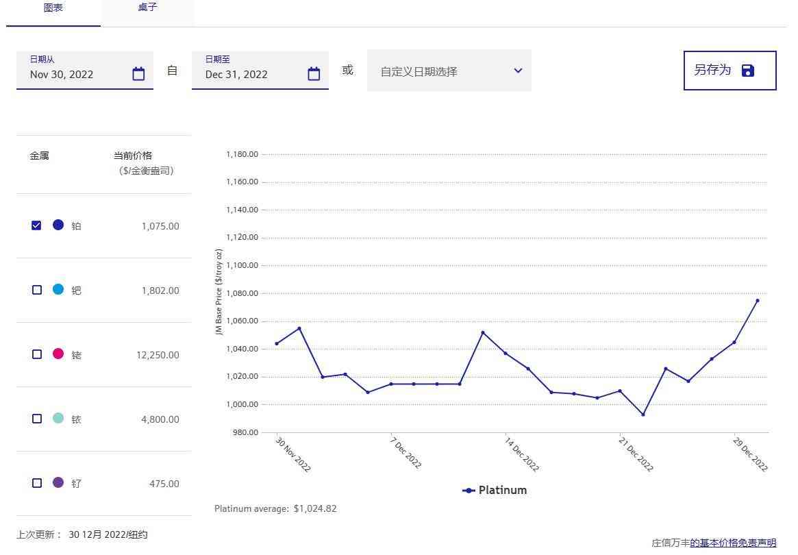 鉑是一種金屬,常用于制造電子元件、精密儀器和設(shè)備,用于電子行業(yè)的許多應(yīng)用。它還可以用于制造汽車尾氣凈化器,以減少汽車尾氣排放的污染物,以及用于制造醫(yī)療器械,如放射治療裝置和放射檢測(cè)儀器。此外,鉑還可以用于制造珠寶首飾,因?yàn)樗哂心透g性,美觀大方,而且價(jià)格也不貴。下面我就把鉑金的價(jià)格走勢(shì)圖分享出來,大家可以看看鉑最近的價(jià)格走勢(shì)。