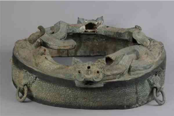 龍虎紋鼓座,春秋時期,安徽博物院“八大鎮(zhèn)館之寶”之一。鼓座上沿四周運用高浮雕的手法,塑有怒吼的猛虎與獨角翹立的游龍。