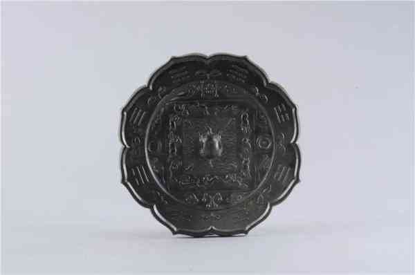 八卦十二辰菱花銅鏡,唐代,鏡呈八瓣菱花形,瓣內(nèi)飾八卦紋,間以植物紋。鏡鈕為龜形,鈕周飾海水紋,周圍按矩形排列十二生肖圖案,外飾卷云紋。
