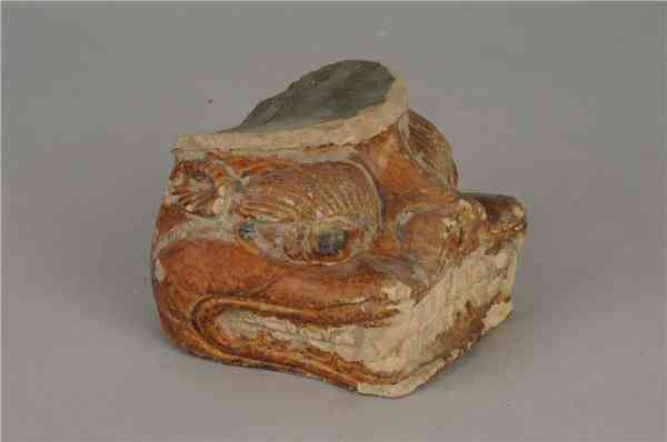 醬釉虎頭枕,宋代,枕身施醬褐色釉,虎的眼珠以黑彩點繪,張口露齒,顯出虎的兇猛。