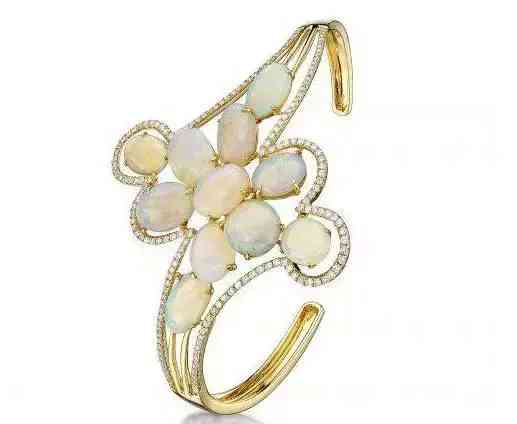 如果你想在一只玉鐲上看見紅寶石的火焰,紫水晶的色斑,祖母綠的清新,那就選它吧!歐泊被譽(yù)為寶石界的調(diào)色板,以其特殊的變彩效應(yīng)而聞名于世。它的成分主要是蛋白石,以及少量的石英、黃鐵礦等,有白色、黑色、深灰色、藍(lán)色、綠色、棕色、橙色、橙紅色等多種體色,呈現(xiàn)透明至不透明的玻璃光澤至樹脂光澤,硬度為5~6。