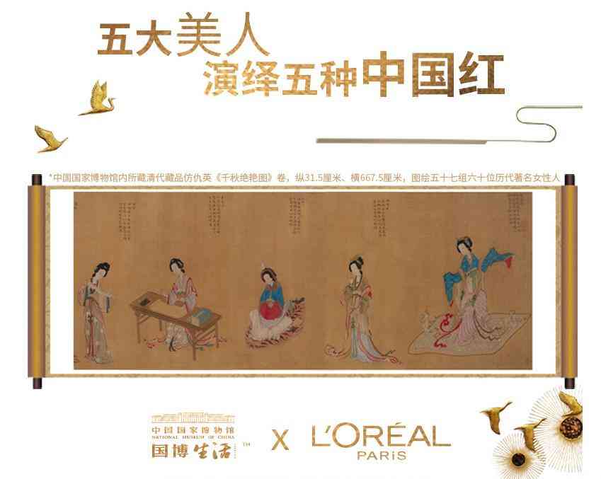 故宮和國際大牌的合作遲遲沒有下文,這個創(chuàng)意卻被人捷足先登——國家博物館和巴黎歐萊雅合作了。二者合作推出了5款限量口紅禮盒,靈感來自國博館藏的清代藏品仿仇英《千秋絕艷圖》,巴黎歐萊雅的幾款普通色號的口紅披上古典美女的外衣后似乎也沾上了仙氣:趙飛燕、王昭君、西施、楊玉環(huán)、李清照都來代言了。