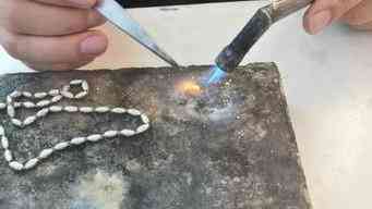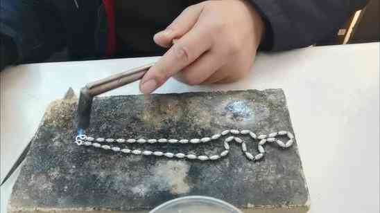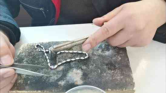 第1步、把項鏈斷裂的地方用火燒紅燒軟并蘸水,把斷裂的地方連接好合嚴,擺好方向和位置,用火把銀焊片燒化。
