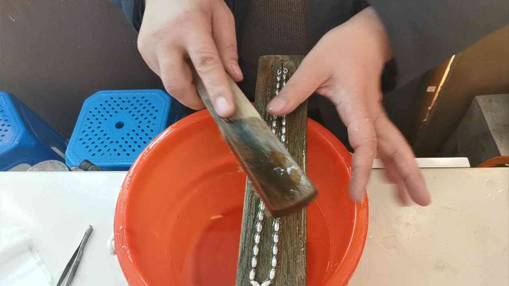 第5步,用超聲波清洗器對項鏈進行超聲波清洗,此步驟主要是把項鏈轉(zhuǎn)運珠里面的酸完全的清洗出來,以免有殘留的酸,傷害到顧客的皮膚。