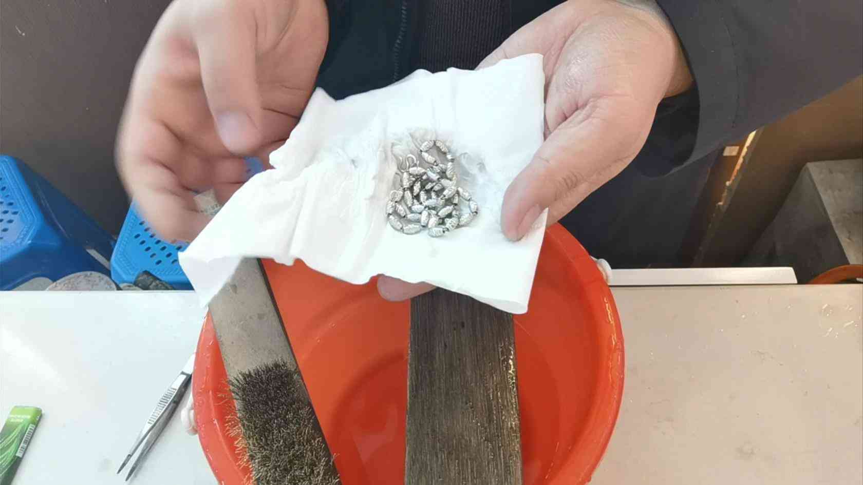 第4部,用銅刷子把轉(zhuǎn)運珠項鏈進行刷洗,在刷洗的時候要小心,不要用力過猛把項鏈兒給搞斷了,直到把項鏈兒全身都刷洗的潔白光亮。