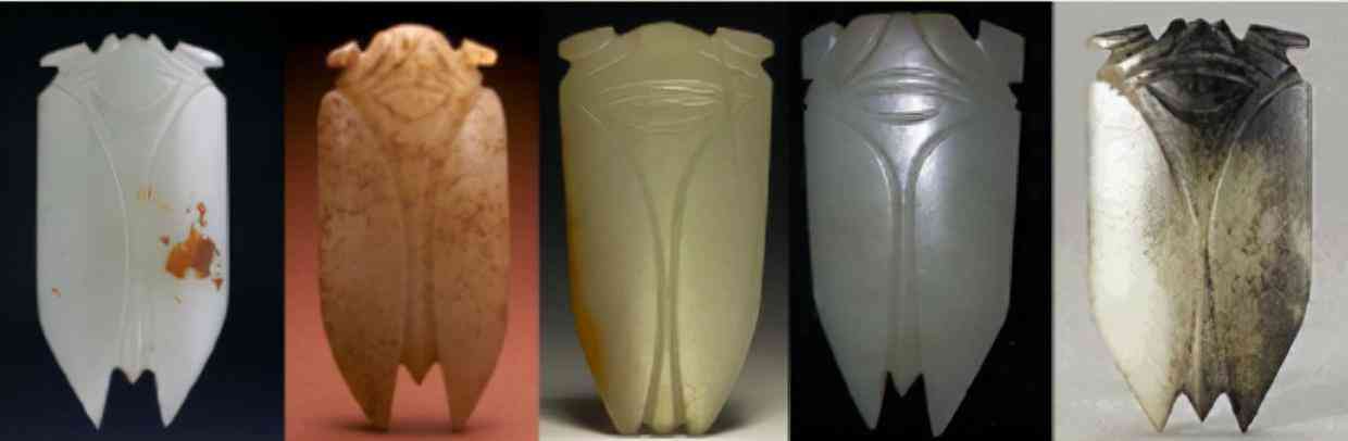 如果是佩蟬,由于需要佩戴在腰間或者胸前,所以均有穿孔,而且雕刻材料大多選用細(xì)膩廣潤(rùn)的新疆和田玉,造型也大多為扁片狀。相比之下,琀蟬則大多采用一些未經(jīng)加工的碎玉塊。