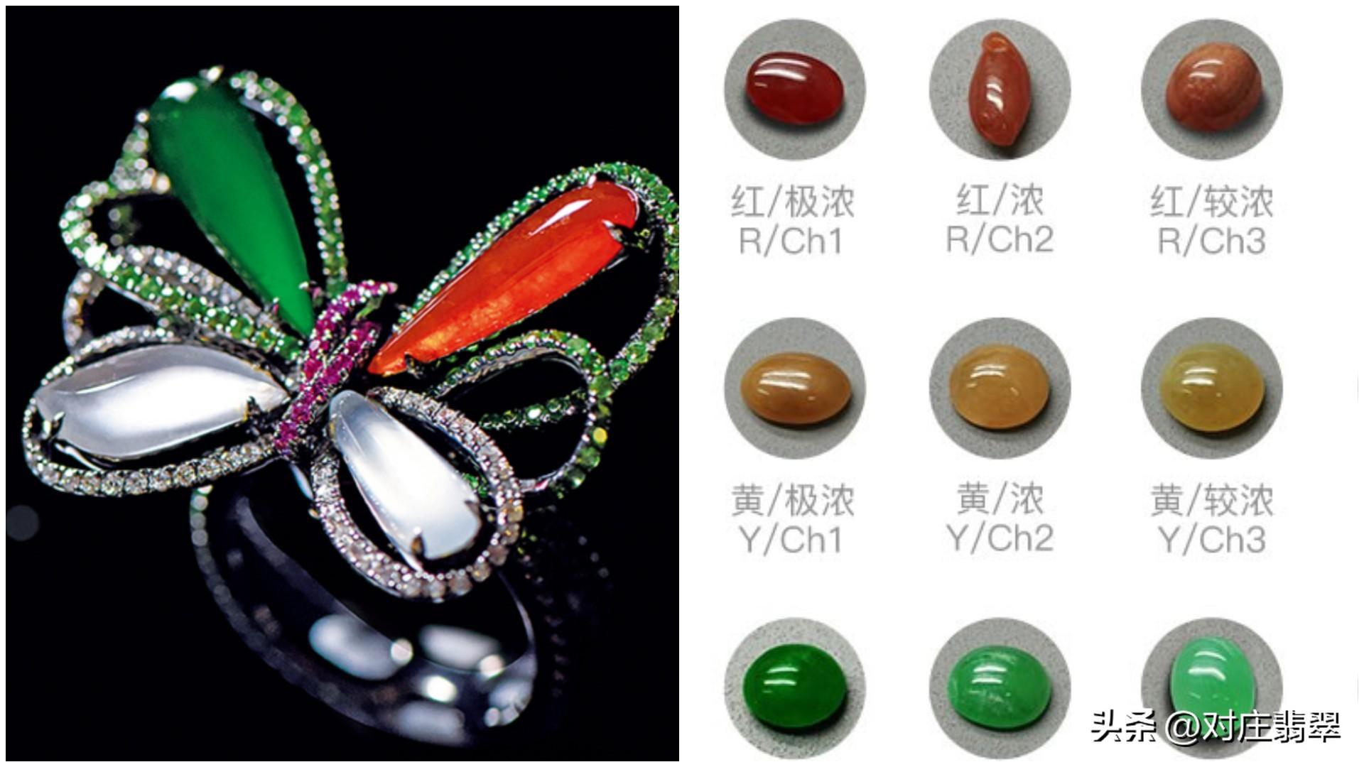 顏色絢麗的高品質(zhì)紅翡,與綠色和白色翡翠搭配出一只彩蝶,種水高,顏色達到極濃,美艷動人。