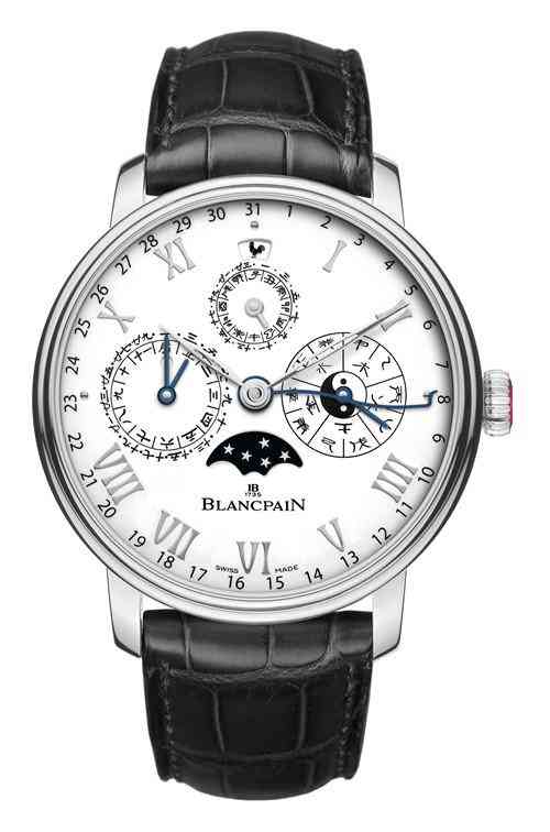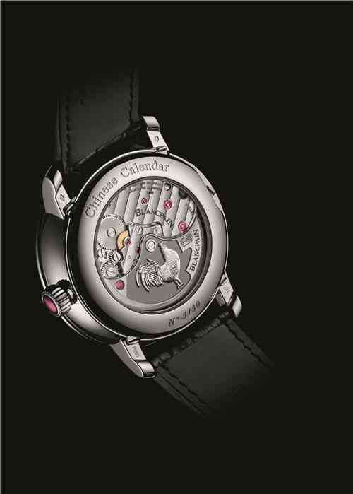 2017年寶珀推出雞年限量款腕表,表盤正面12點位,精神抖擻的雄雞以蓬勃之姿站立于大明火琺瑯表盤視窗之上,斗志昂揚邁步新年。透過表背藍寶石鏡面,由金雕大師匠心而作的雄雞造型擺陀清晰可見。腕表采用45毫米直徑鉑金表殼,表冠飾以凸圓形切割紅寶石,表耳下方采用寶珀專利設計的5個隱藏式調校按鈕,在調校同時確保了表側簡潔流暢的線條美感。寶珀中華年歷表雞年鉑金限量款集合了Villeret經典系列所有的經典標識和特色,如雙層表圈、大明火琺瑯表盤、鏤空柳葉型指針、標準日歷的蛇形藍鋼指針等。寶珀中華年歷表雞年鉑金款限量發(fā)行36枚,編號1到50,逢4跳過。亦有非限量版的紅金款可供選擇。