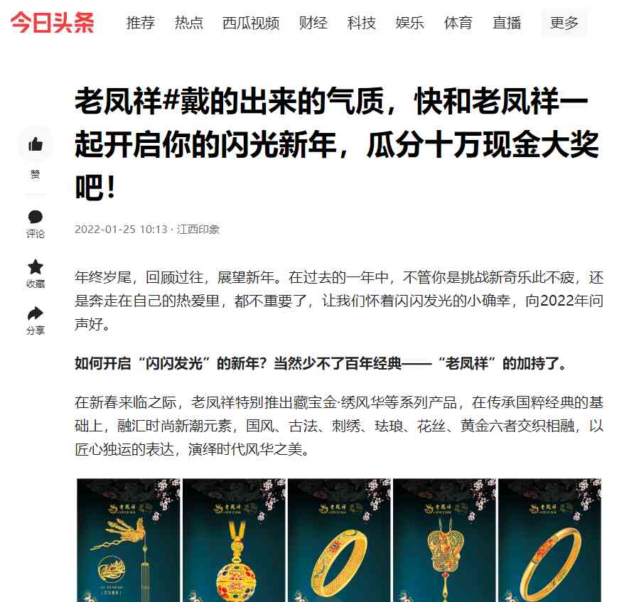 1月28日,由@老鳳祥江西發(fā)起的#戴的出來的氣質(zhì) 抖音話題正式開啟,@kiki糖、@李可愛、@大穎大穎、@冰晴玲等抖音達(dá)人率先前往老鳳祥線下門店,將老鳳祥系列產(chǎn)品佩戴而上,演繹時(shí)代芳華之美!