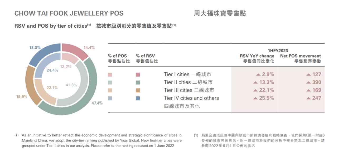 據(jù)財報披露,4-9月周大福在三線城市零售點新增169個,在四線城市及其他新增247個。相比之下一線城市僅127個,三四線城市擴張速度明顯快于頭部城市。