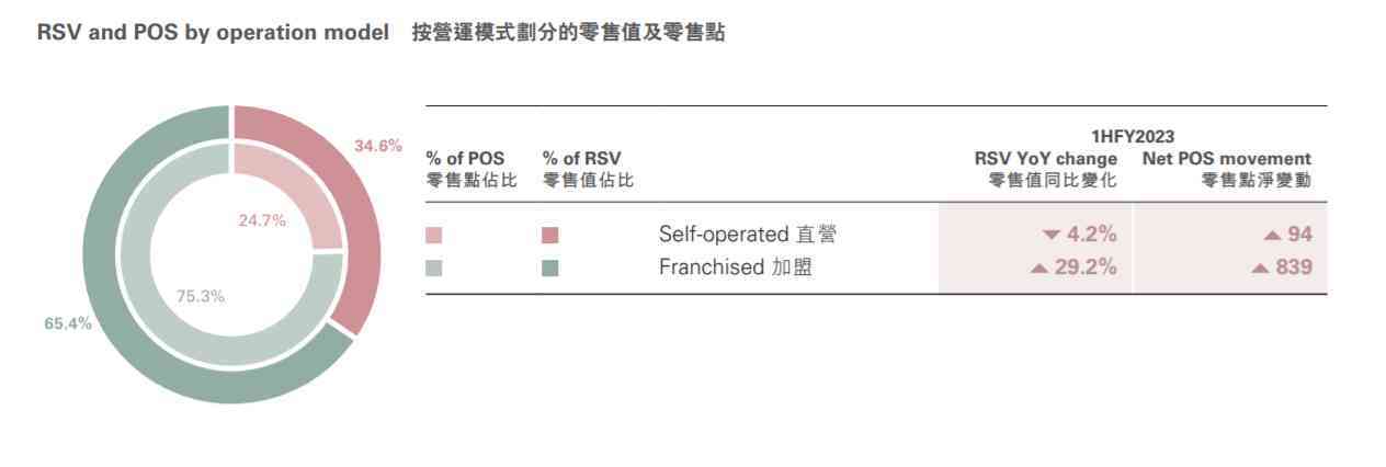 報告期內(nèi),內(nèi)地同店營收下跌7.8%。按同店計算,加盟零售點于期內(nèi)的營收下跌3.5%。