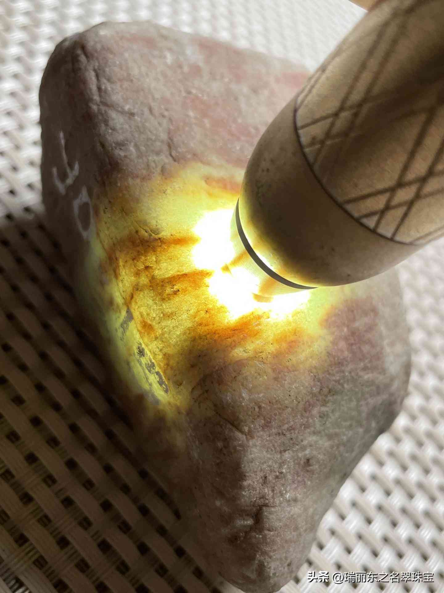 木那場口的料子,新手來玩的話其實不是很建議的。為什么呢?因為木那料子真正是玩霧層玩內(nèi)化的,內(nèi)化顧名思義,它就是由內(nèi)而外往外化開。那到底什么樣的料子,它才具備一個內(nèi)化的這種能力呢?真正能夠內(nèi)化的木那,它的沙一定是特別特別緊湊的。而且外形看來是有棱有角的,所謂料子的有棱有角,就是說它的一個棱角,它的面已經(jīng)達到6個及6個以上。并且它的霧層是很厚的,因為越厚那它會化的越好。我們壓燈上去之后,它的表現(xiàn)一定是有點朦朧,并且它過光的速度會非???。它不是說整個那種透光,不是水頭長的那種透,能夠看到它朦朦朧朧,說明這個料子是有霧層的表現(xiàn)的。