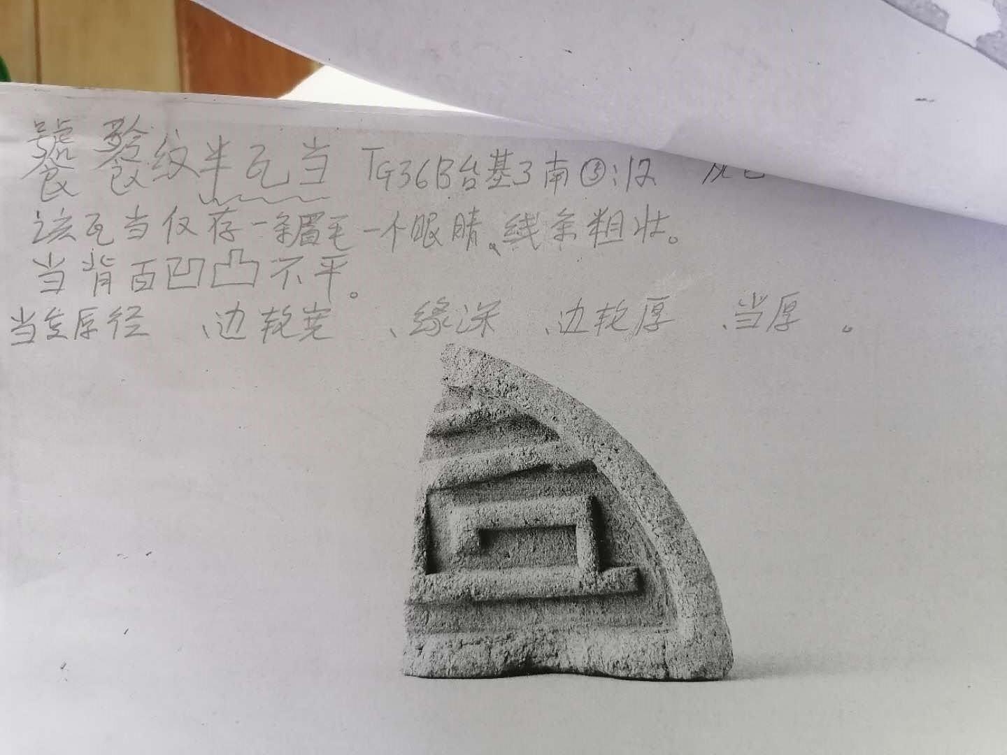 在某一頁(yè)上,李毓芳的圓珠筆勾出一只梅花鹿的身體。“寨子村朱xx麥子地獲得?!蓖弋?dāng)相片的一側(cè)是李毓芳密密的鉛筆批注,她寫道,瓦當(dāng)灰色且完整,“當(dāng)面大部分被磨平,僅存右向奔跑的梅花鹿半個(gè)身子和模糊不清的太陽(yáng)紋。背面不完整,有繩切痕跡?!?/p>