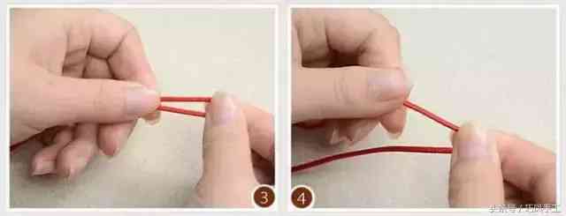 然后將一根紅繩繞成雙線,一只手把住雙紅繩一頭,一只手掌控好彎曲端,如圖3、4所示