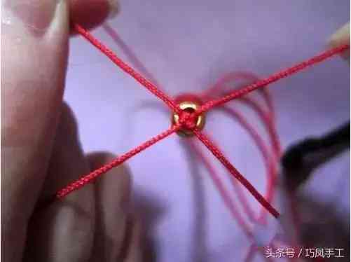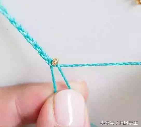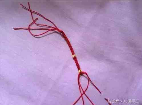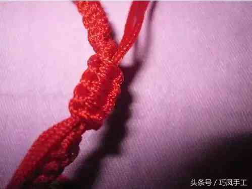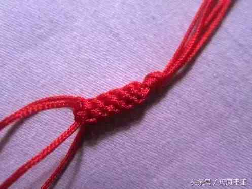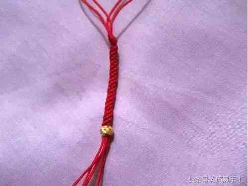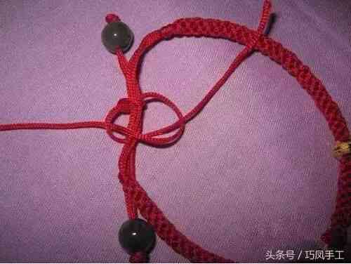 5、換入中間的兩根繩子編兩次蛇結(jié)。以后要一直重復(fù)步驟4,在繩子上串入轉(zhuǎn)運(yùn)珠。
