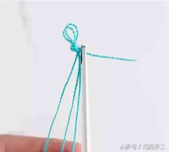 步驟1:將編線對(duì)半剪斷,再將其中剪下的半根再對(duì)半剪斷后取其中1根與另半根對(duì)折后合并在一起(參考下圖所示),在頂部打個(gè)活結(jié),其活結(jié)的環(huán)圈保留0.6cm長(zhǎng),剪去過(guò)長(zhǎng)的第四股線的末端,留下同等長(zhǎng)度的三股線