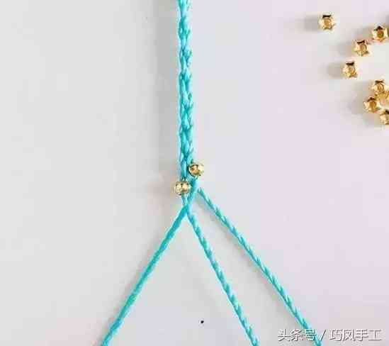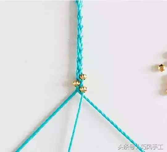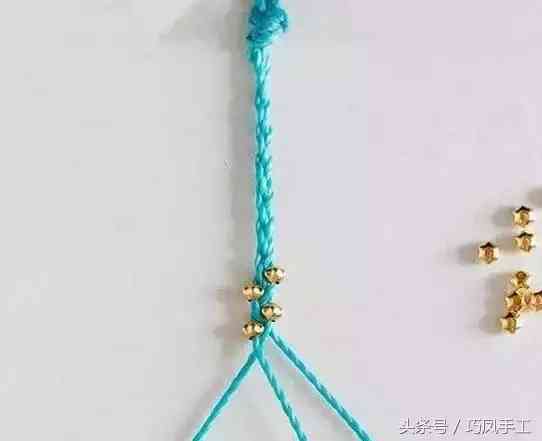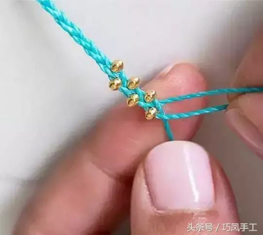 步驟4:將左側(cè)的編線上也串入1顆珠子后,與中間的編線交叉換位,再次將右側(cè)的編線上串入1顆珠子后與中間的編線交叉換位,編織的方法還是與三股辮一樣