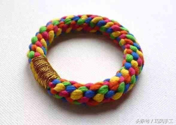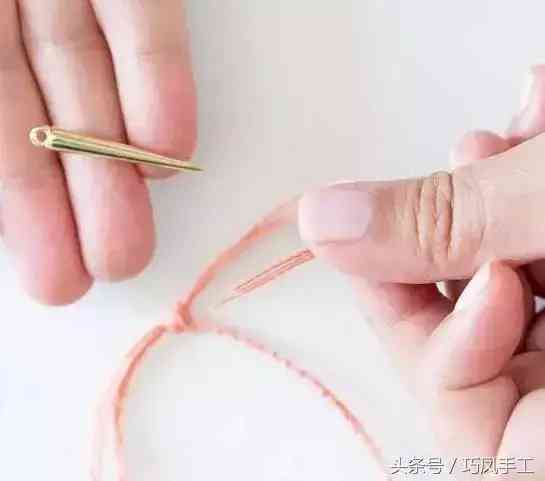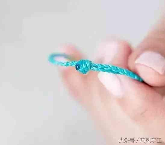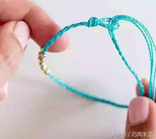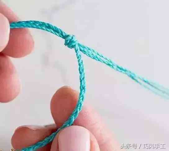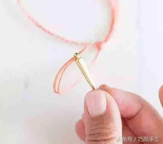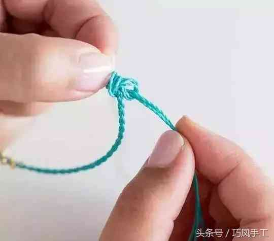 步驟7:編織出一定長(zhǎng)度后,繞在手腕上,測(cè)量出手鏈所需長(zhǎng)度,將編織的一端穿入另一端的環(huán)圈中