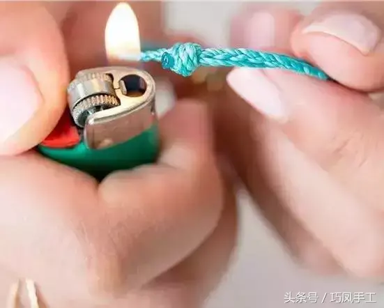 步驟12: 將三股線線頭末端使用打火機(jī)燙結(jié)在一起,凝結(jié)的線頭可防止脫出滑結(jié),佩戴后可抽拉線頭即可收緊手鏈