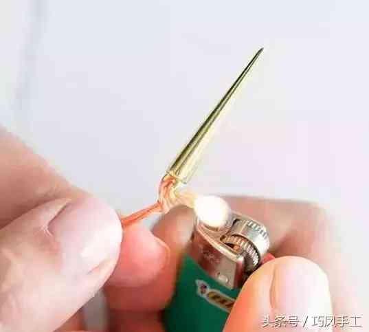 把珠子穿進(jìn)去后,打個(gè)結(jié),末端也用打火機(jī)燒一下。兩頭都用同樣的方法。