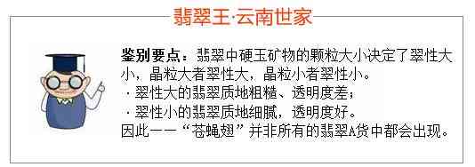一般認為,翡翠的“翠性”是指可以直觀看到翡翠表層的硬玉礦物解理面在光線照射下出現(xiàn)一個個猶如蒼蠅翅膀亮白色反光的特征,俗稱“蒼蠅翅”。但是嚴格地說,翡翠的“翠性”應(yīng)當(dāng)是指翡翠中主要組成礦物硬玉的顆粒大小和相互組合關(guān)系在肉眼觀察下的直觀表現(xiàn)形式,“蒼蠅翅”僅僅是翡翠“翠性”的一種表現(xiàn)形式。