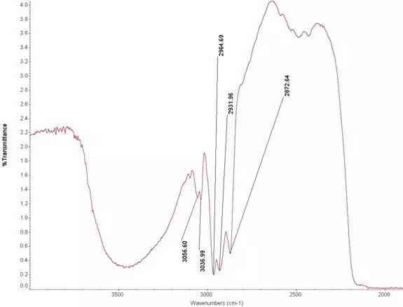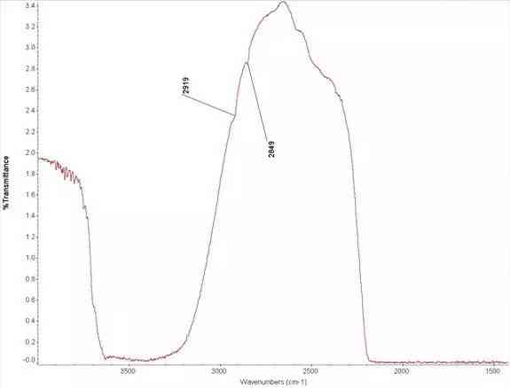 圖27 翡翠A貨紅外光譜。A貨紅外光譜,只有兩個蠟的峰位。