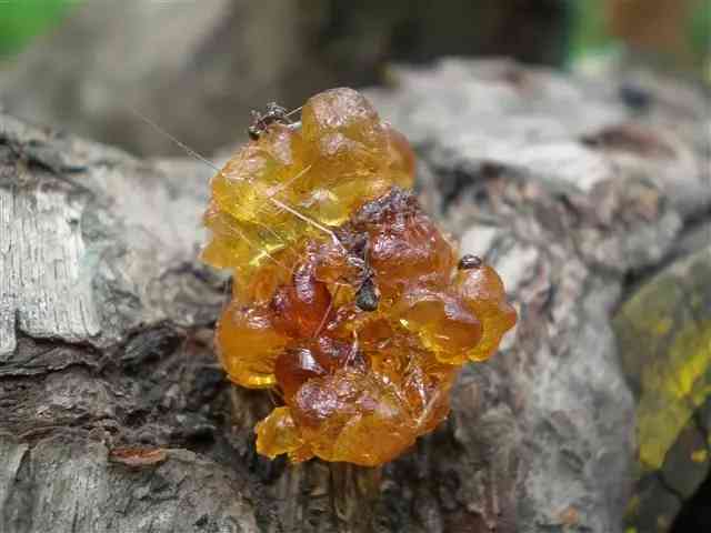 在地下幾十萬年后形成上圖的樣子,尚未完全石化。有的把這種叫柯巴樹脂。
