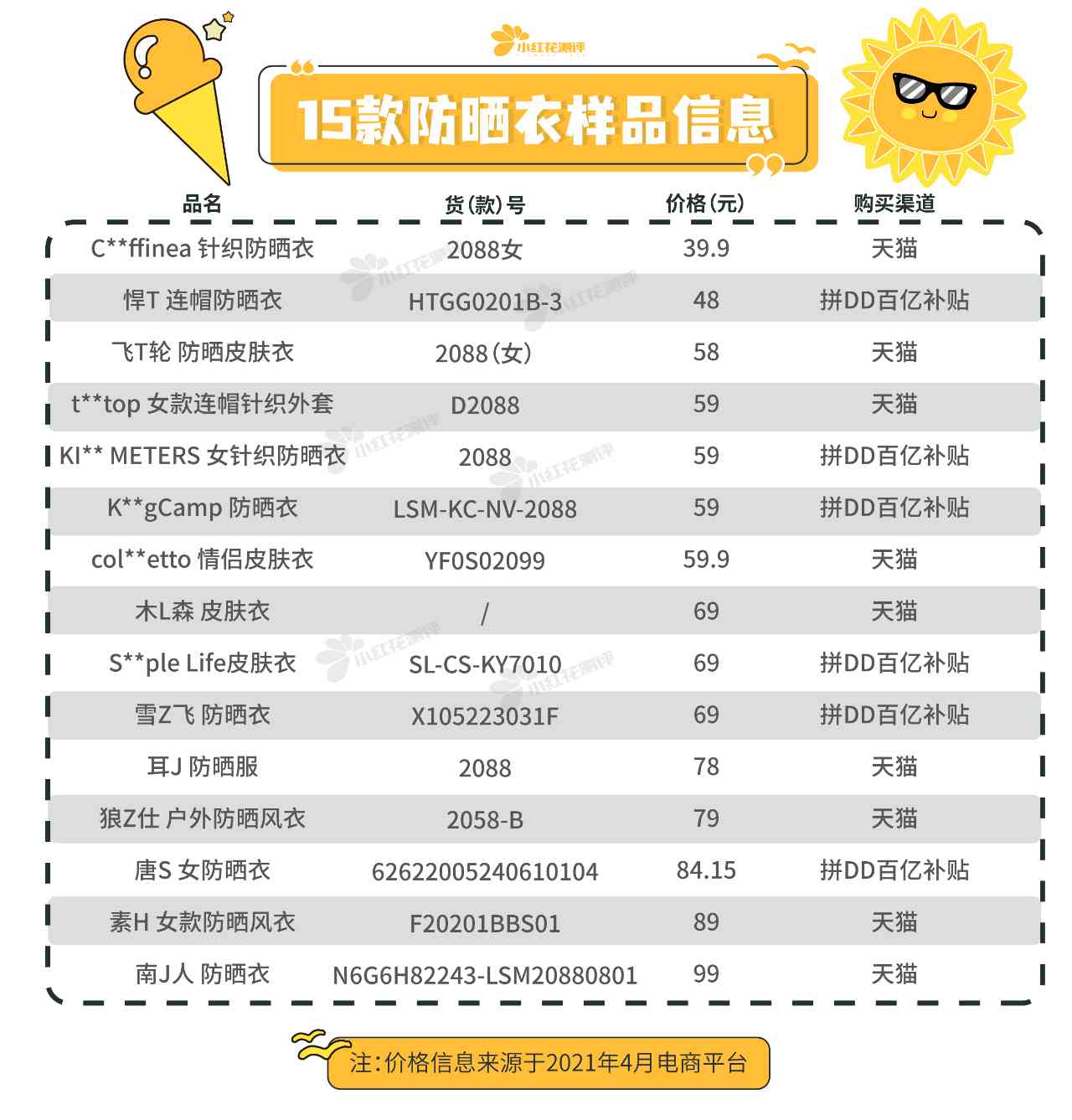 因此,花爸重新選了15款百元以下的成人防曬衣,進(jìn)行測(cè)評(píng)。其中9款來自“天貓”,6款是“拼多多”百億補(bǔ)貼款。
