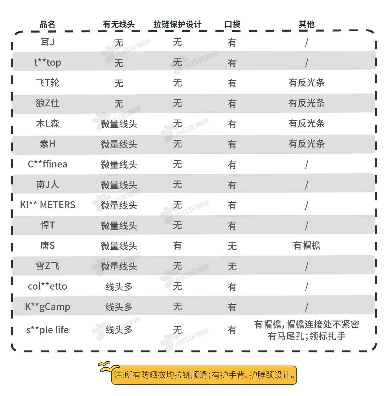 經(jīng)過對(duì)15款防曬衣的仔細(xì)檢查,各款產(chǎn)品的做工細(xì)節(jié)如下: