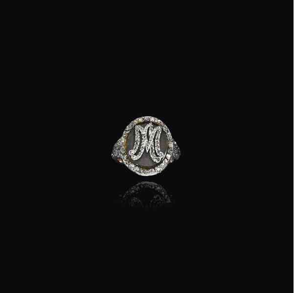 這是一枚鑲嵌了一綹頭發(fā)并帶有字母裝飾的戒指,戒指內(nèi)的頭發(fā)屬于瑪麗王后本人,戒指上的字母“M”和“A”是她的名字縮寫,上面鑲嵌了玫瑰形鉆石。這枚戒指和其他兩枚戒指一同被瑪麗王后贈送給了她的女兒昂古萊姆公爵夫人。成交價(jià):44.7瑞士法郎(約合人民幣308萬)