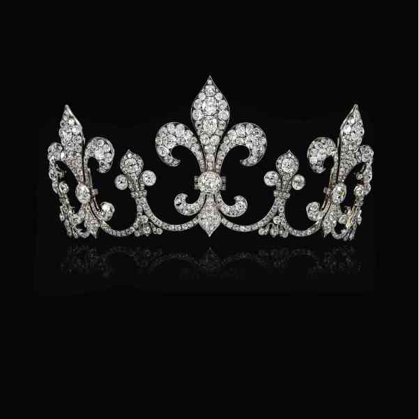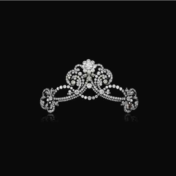 這是一個(gè)葉狀漩渦設(shè)計(jì)的鉆石頭冠,中間和側(cè)面的圖案可以拆卸。1903年奧地利瑪麗?安妮大公(Archduchess Marie Anne of Austria)與帕爾馬王子布爾邦(Prince Elie de Bourbon-Parme)婚禮當(dāng)天,瑪麗?安妮就佩戴著這頂由奧地利國王弗朗索瓦?約瑟夫(Fran?ois Joseph)贈送給她的頭冠完成了婚禮。成交價(jià):25萬瑞士法郎(約合人民幣172萬)