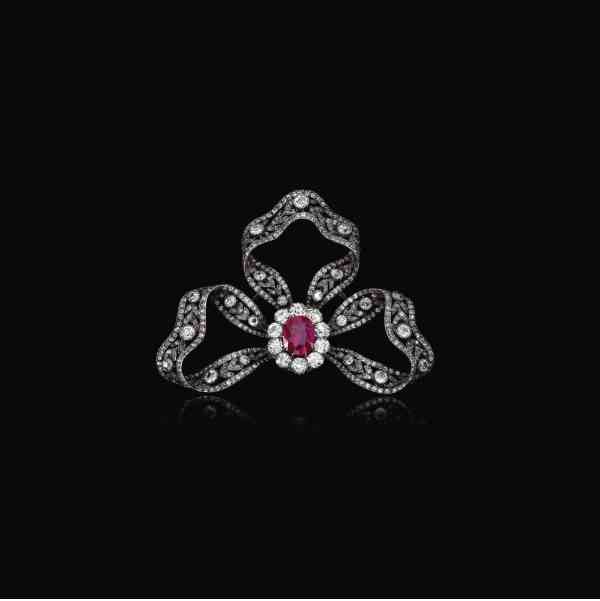 這是一個(gè)精美的紅寶石鉆石胸針,以圓形和玫瑰形鉆石裝飾,中間鑲嵌一顆重達(dá)6.89克的墊形紅寶石。這個(gè)胸針也可作為頭飾使用,而中間的紅寶石可單獨(dú)拆卸下來,作為吊墜佩戴。這是1905年由奧地利弗雷德里克大公(Archduke Frédéric of Austria )贈送給他的女兒奧地利瑪麗?安妮大公的,為了紀(jì)念瑪麗?安妮的兒子查爾斯出生。成交價(jià):37.5萬瑞士法郎(約合人民幣258萬)