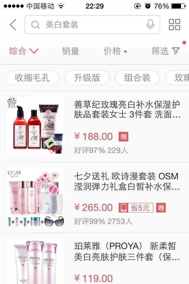 我看了當(dāng)時(shí)這個(gè)品牌京東其他賣家的主推款,化妝品套裝他們主推一款99元的基礎(chǔ)護(hù)膚套裝,和489元的美白套,銷量已經(jīng)上千了。所以我就避其鋒芒,選擇了一套269元的和一套349元的化妝品套裝為主推款。