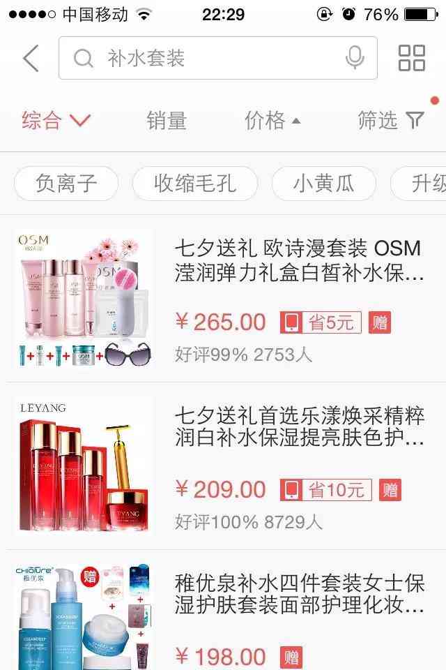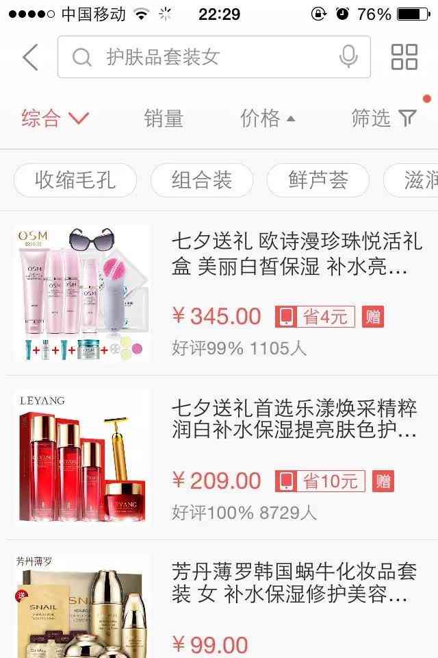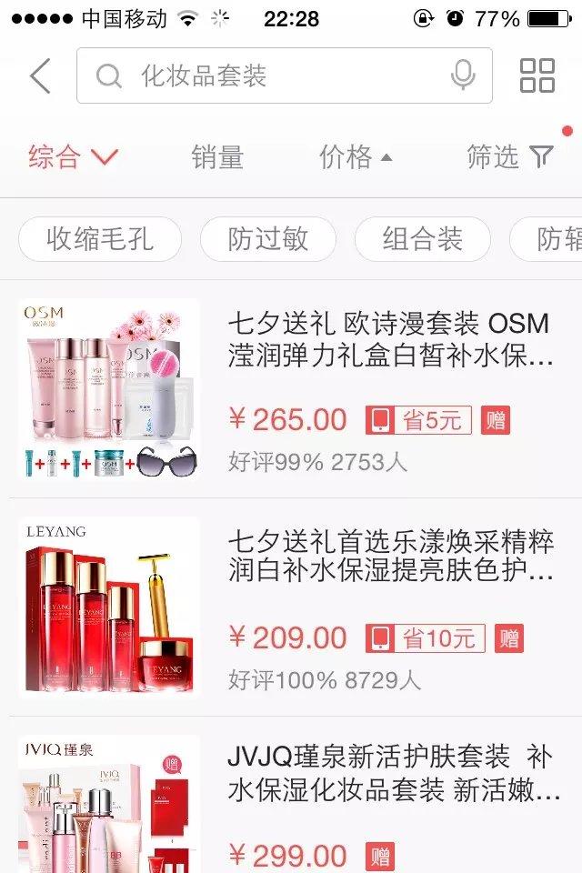 我一個(gè)西安的朋友當(dāng)時(shí)看到我排名這么靠前,過來跟我學(xué)了優(yōu)化排名的方法后,也跟著我去優(yōu)化,后來他的排名也緊跟著我的排名,圖中209這款化妝品套裝就是他家的。