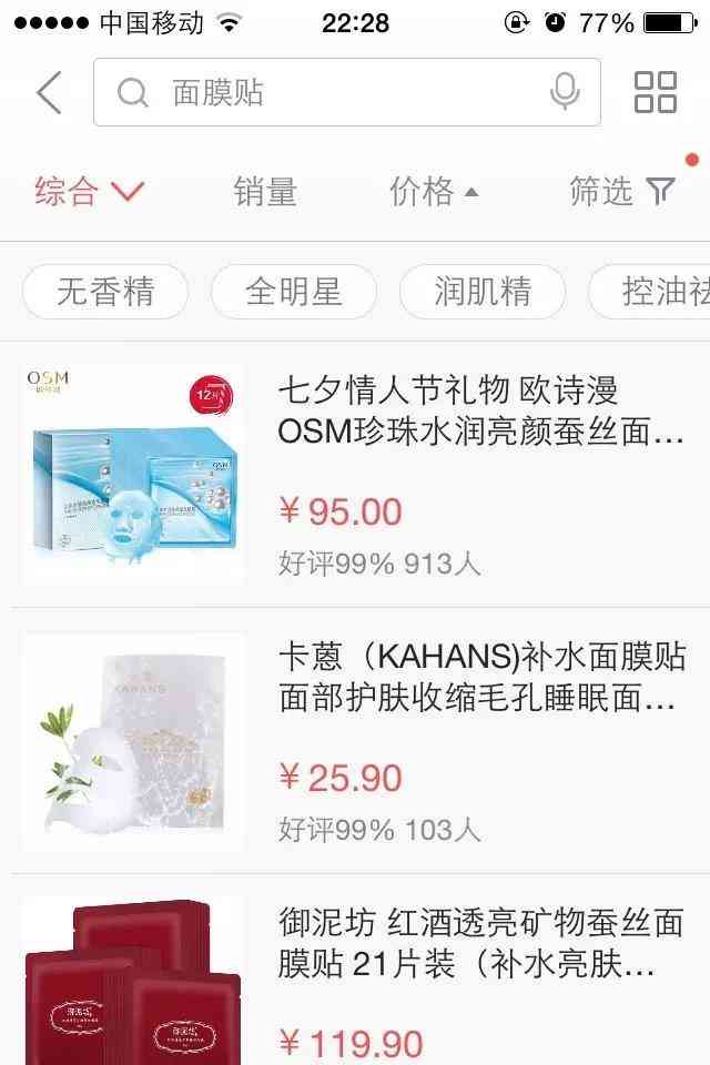 面膜京東當(dāng)時(shí)占首頁前面坑位的是40-60元(5-10片)價(jià)位,119元21片價(jià)位兩個(gè)段位,顏色為白色、紅色居多,我選了一款定價(jià)是99元20片藍(lán)色盒裝的面膜。這樣的話,價(jià)位和色調(diào)就有所差異化了。