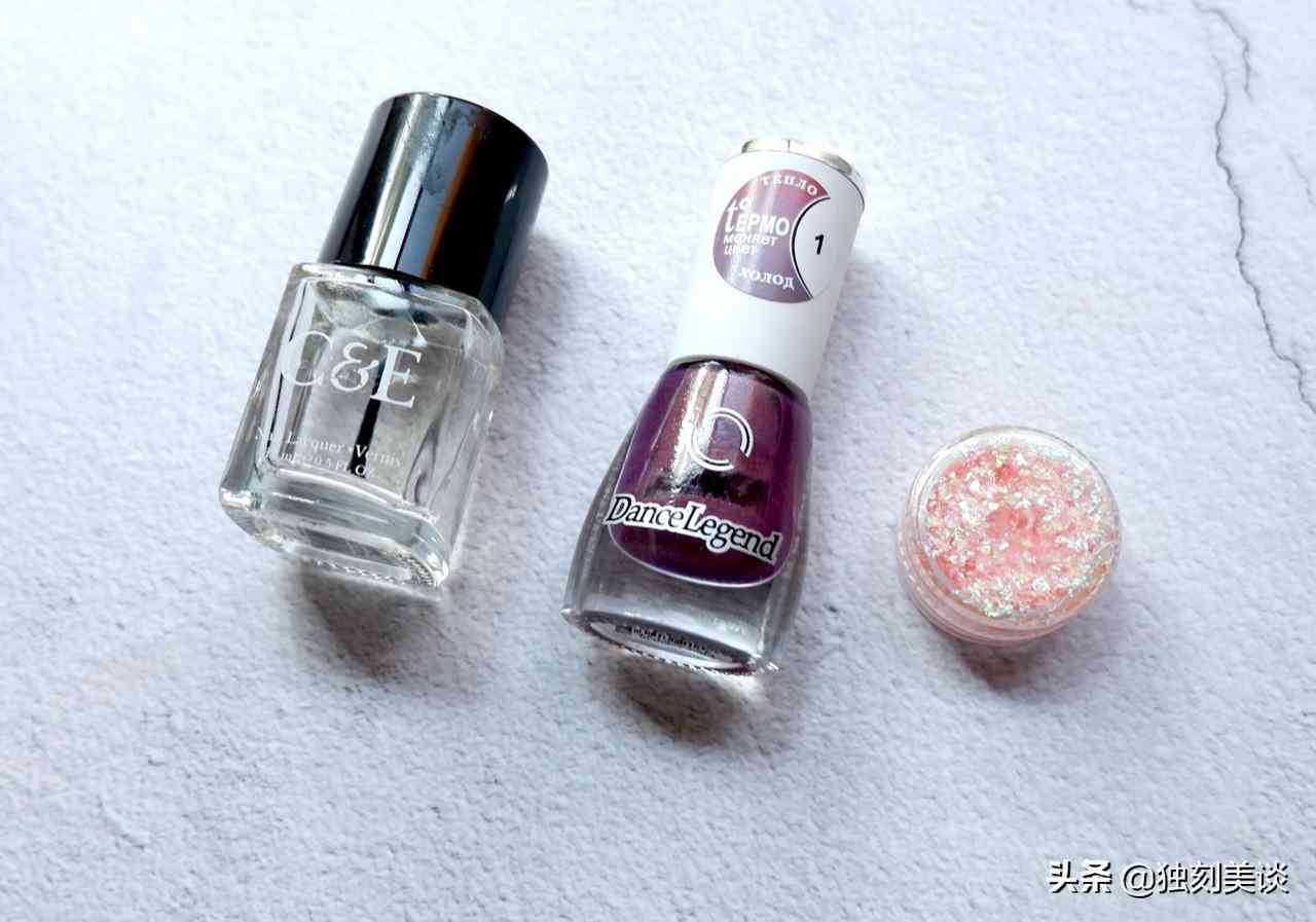 為了用作演示效果,我選擇了顏色較深的底油——「DanceLegend」溫變甲油,玫紅色-深紫色,根據(jù)溫度而變化;搭配了橘粉色帶綠偏光的亮片。