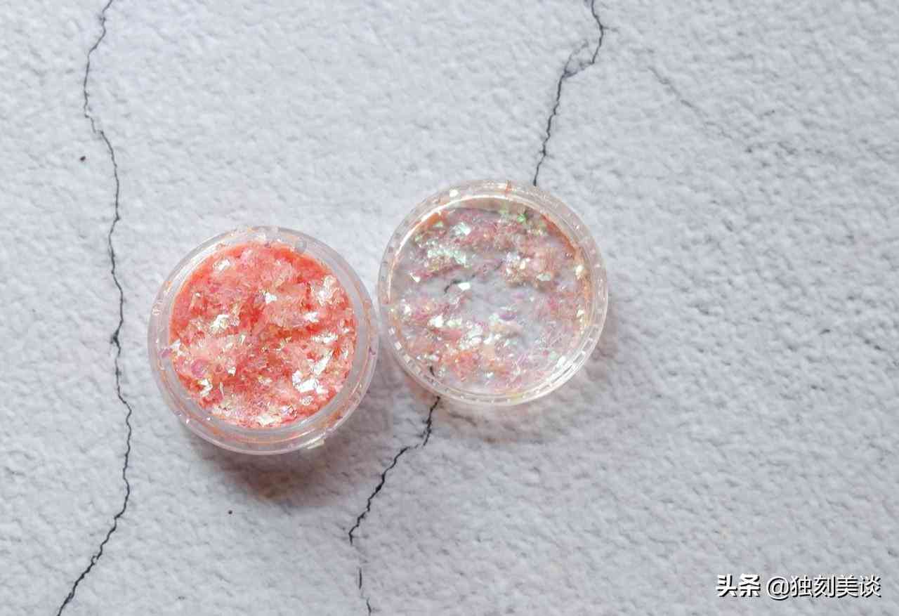 還有一些金蔥質(zhì)地的亮片,顆粒是不透明的,所以比較適局部使用,如只用在指甲前端,做成法式美甲的結(jié)構(gòu)。