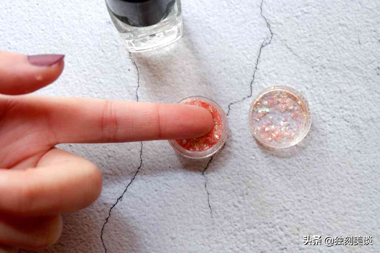 用差不多干透的指甲蓋去沾亮片,沾到你希望取到的量。