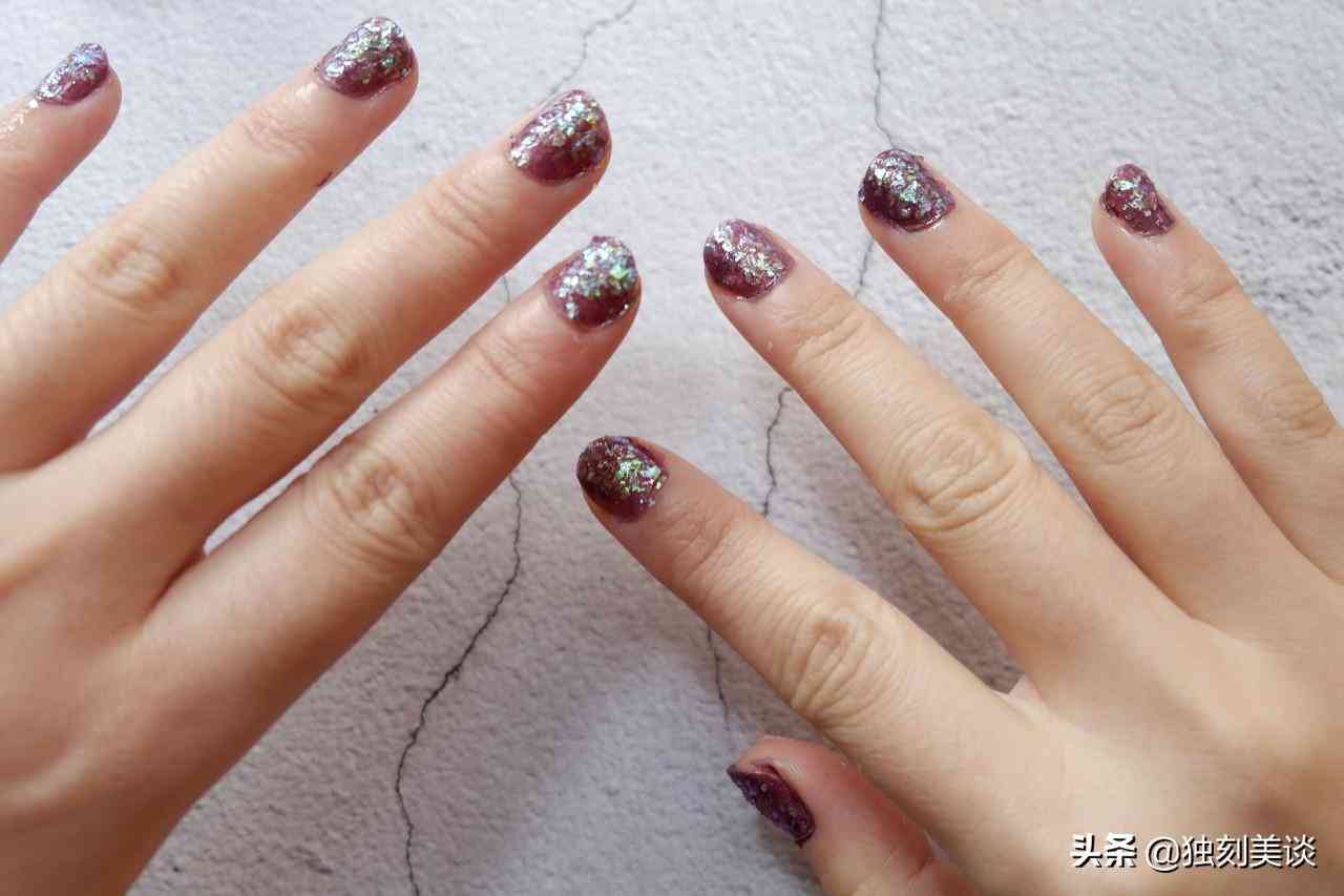 其實(shí)這種亮片涂得越輕薄越好,如果是薄薄的亮片均勻地鋪了一層,就能呈現(xiàn)“低調(diào)奢華感”。