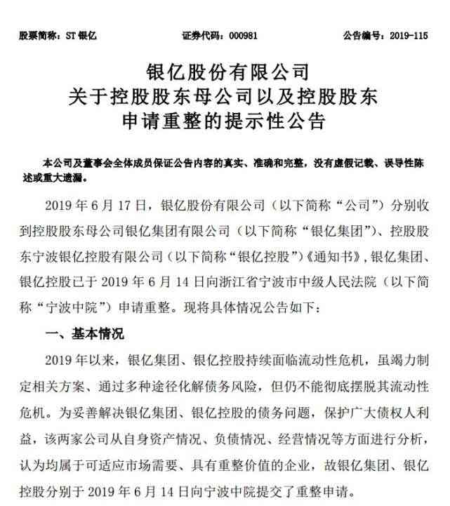 6月17日中午,上市公司ST銀億發(fā)了公告,銀億集團(tuán)、銀億控股已于2019年6月14日向浙江省寧波市中級(jí)人民法院申請(qǐng)重整。