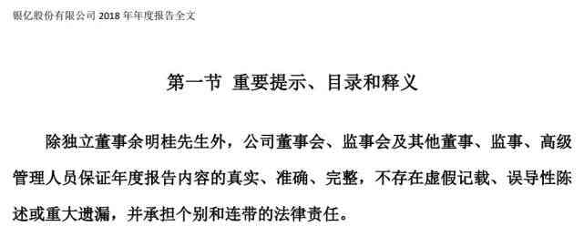 銀億股份2018年年度報(bào)告顯示:除獨(dú)立董事余明桂先生外,公司董事會(huì)、監(jiān)事會(huì)及其他董事、監(jiān)事、高級(jí)管理人員保證年度報(bào)告內(nèi)容的真實(shí)、準(zhǔn)確、完整,不存在虛假記載、誤導(dǎo)性陳述或重大遺漏,并承擔(dān)個(gè)別和連帶的法律責(zé)任。