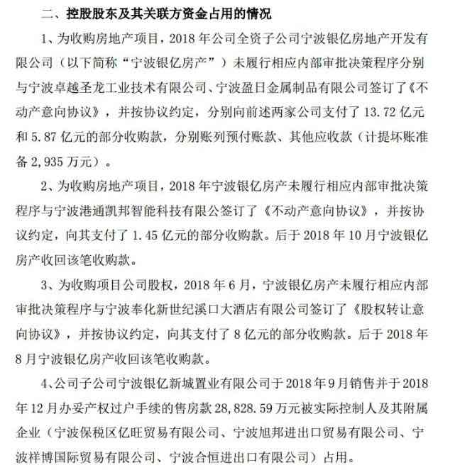 st銀億此前公告,為收購(gòu)房地產(chǎn)項(xiàng)目,2018年公司全資子公司寧波銀億房產(chǎn)未履行相應(yīng)內(nèi)部審批決策程序分別與寧波卓越、寧波盈日公司簽訂了《不動(dòng)產(chǎn)意向協(xié)議》,并按協(xié)議約定,分別向前述兩家公司支付了13.72億元和5.87億元的部分收購(gòu)款。